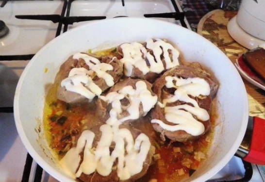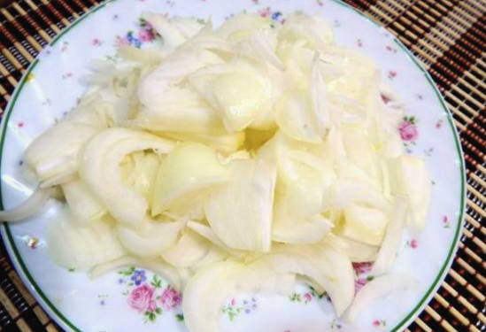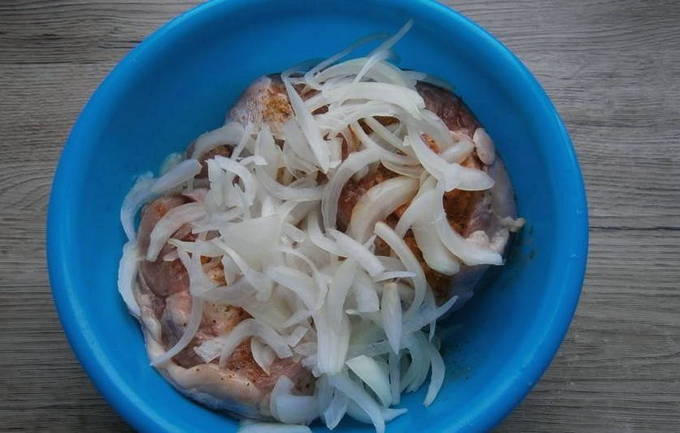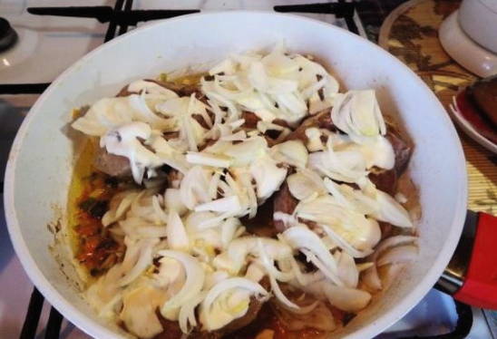 - We verwarmen een koekenpan met plantaardige olie op het fornuis. Bak eerst de steaks tot een heldere blos en laat ze vervolgens 5-10 minuten sudderen met uien.