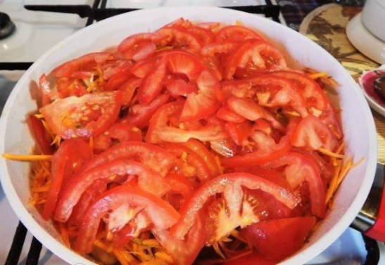 - Strooi de wortels over het gebakken vlees. Wij verminderen het vuur.