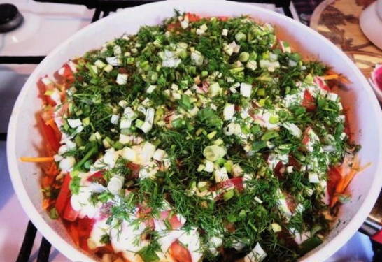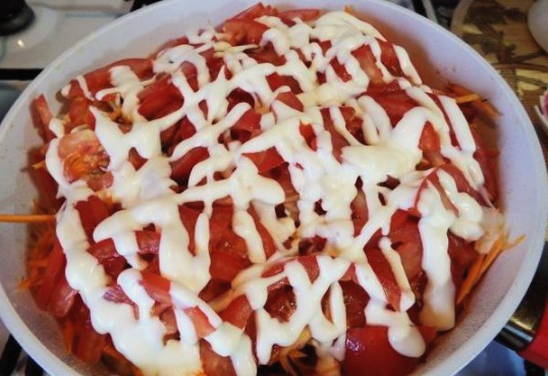 - Schenk de helft van de mayonaise op het gerecht. We verspreiden de uien.