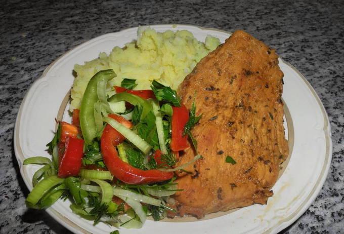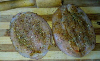 - Doe de kalkoensteaks in een diepe kom. Bestrooi met plantaardige olie, bestrooi met zout en kruiden naar smaak.