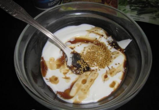 - Combineer zure room met mosterdzaad en een theelepel sojasaus in een diepe kom. Roer het eten.