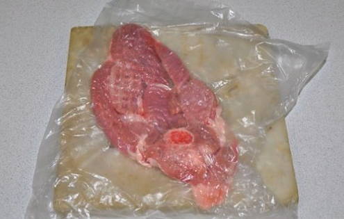 - Kies voor het koken steaks met bot. Hiervoor is een kalkoendrumstick geschikt. We wassen het vlees en vegen het af met een papieren handdoek.