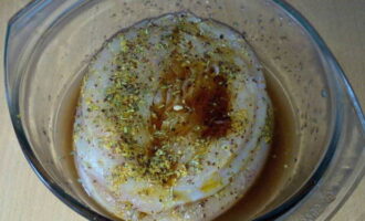 - Meng in een diepe kom de sojasaus met honing, zout en zwarte peper. We dompelen het vlees in de marinade.