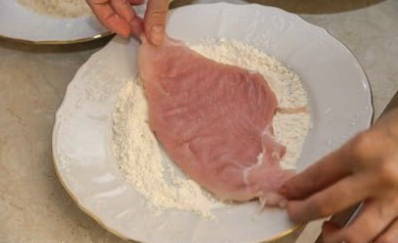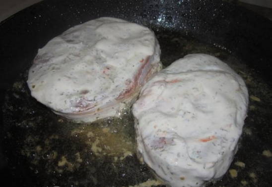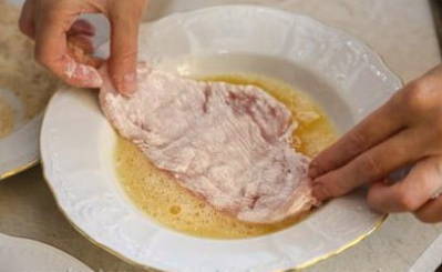- We dompelen elk stuk vlees in beslag en bakken het vervolgens in plantaardige olie in een hete koekenpan. Bak aan beide kanten goudbruin.