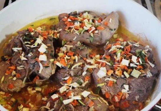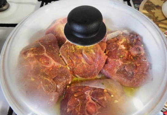- We brengen het werkstuk over naar de pan. Dek af en kook ongeveer 20 minuten. Draai het vlees om.