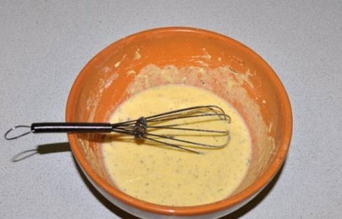 - Meng voor het beslag ei, bloem, zout, zwarte peper, Provençaalse kruiden en gedroogde knoflook. Klop de massa tot een gladde massa en zonder klontjes.