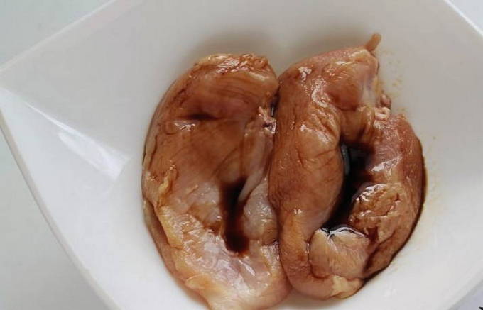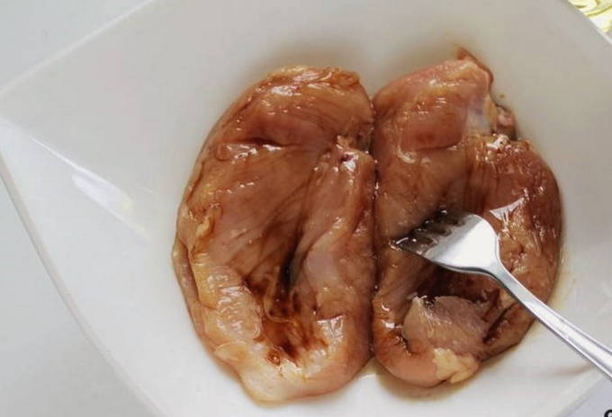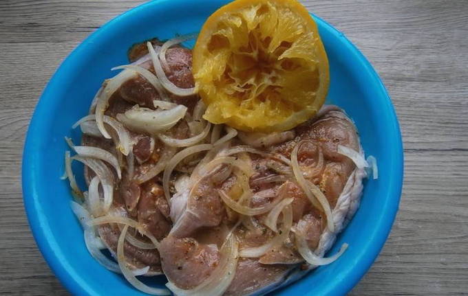 Leg de borst vervolgens in een diep bord. Vul het met wijnazijn, olijfolie en citroensap. We marineren 2 uur in de koelkast.