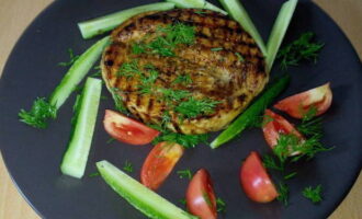 - Heerlijke steaks zijn klaar! Leg ze op een bord en leg ze op tafel, aangevuld met verse groenten en kruiden.