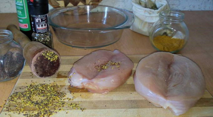 Scheid de kipfilet van het bot. We wassen het, drogen het en wrijven het in met mosterdzaad.