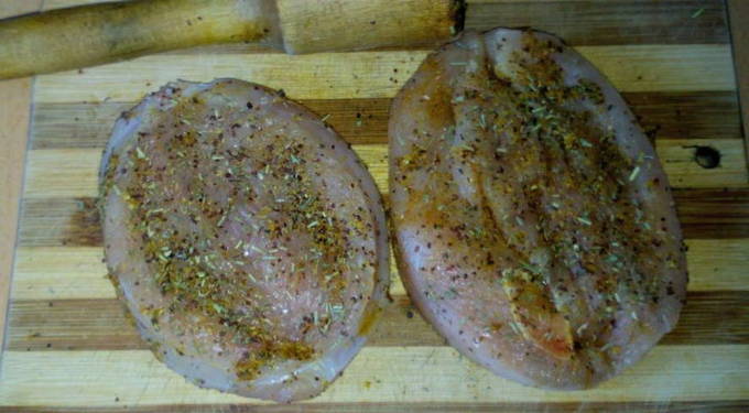 - Doe de kalkoensteaks in een diepe kom. Bestrooi met plantaardige olie, bestrooi met zout en kruiden naar smaak.