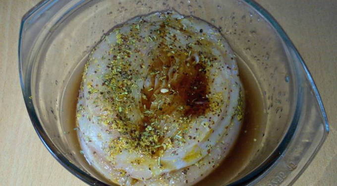Leg de borst vervolgens in een diep bord. Vul het met wijnazijn, olijfolie en citroensap. We marineren 2 uur in de koelkast.