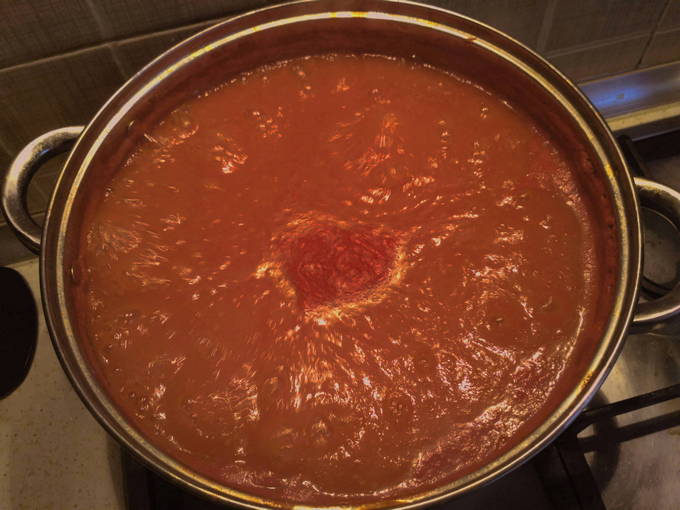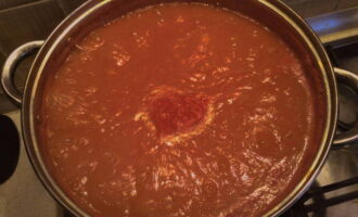 - We wassen de tomaten en verwijderen de kern. Snijd de tomaten in plakjes en doe ze in een pan. Kook de tomaten op laag vuur. Nadat de tomaten zijn geperst, kook ze gedurende 20 minuten. Haal van het vuur en laat de tomaten afkoelen. Giet het mengsel in een vergiet en veeg de saus in een aparte container. Giet zout en suiker bij de saus. Wij mixen.