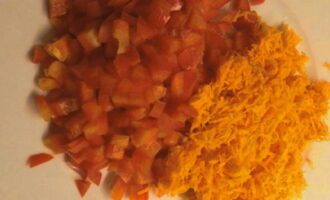- Laten we beginnen met het frituren van groenten. Verwijder de bovenste laag wortelen met een scherp mes en was het vuil af met stromend water. Pel de ui en snijd hem in halve ringen. Wrijf de wortelen op een grove rasp. We zetten een koekenpan met plantaardige olie op het fornuis. Na het verwarmen van de container, doe de ui en bak deze ongeveer 3-4 minuten. Giet de wortelen erbij en fruit de groenten.