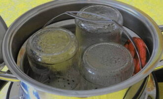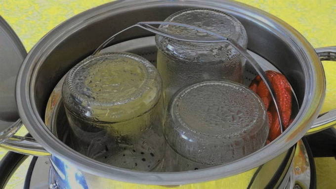 - De hete massa verspreiden we in potten die eerder een warmtebehandeling hebben ondergaan. We bedekken ze met deksels en rollen ze op. We laten de containers een dag met rust, ingepakt.