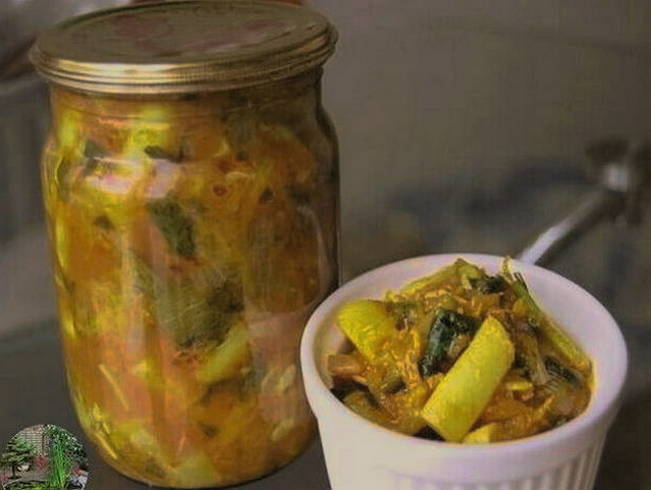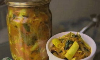 Roer de ingrediënten en giet de azijn erbij. Zet het vuur uit. We reinigen en steriliseren potten met deksels.