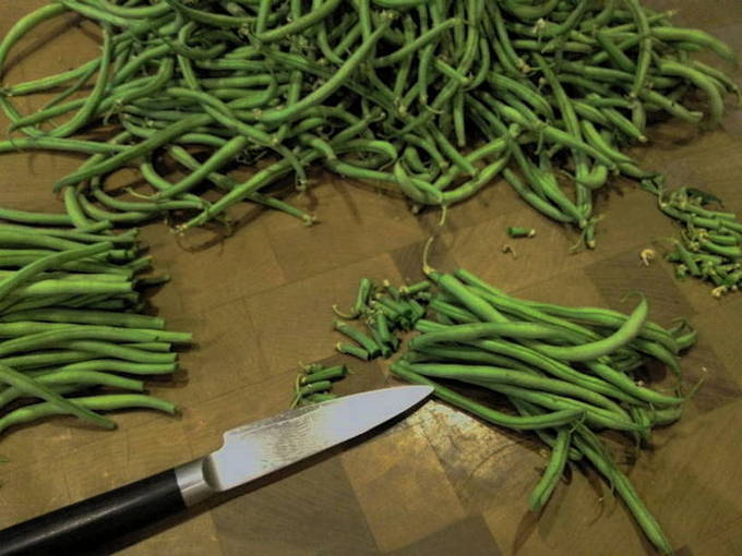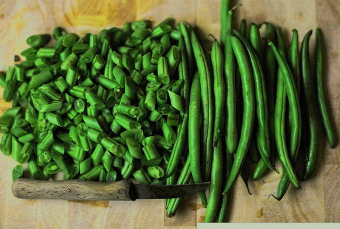 - Eerst sorteren we de bonenscheuten. Wij gebruiken geen overrijpe en beschadigde peulvruchten. Daarna snijden we elke scheut aan beide kanten af (alleen kleine puntjes) en wassen de bonen met stromend water. Als de scheuten droog zijn, snijd je ze in kleine stukjes.