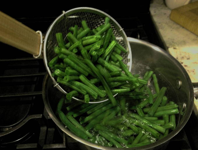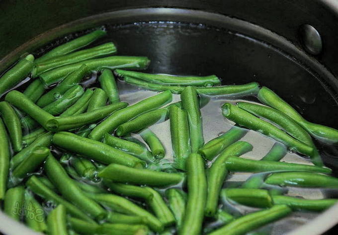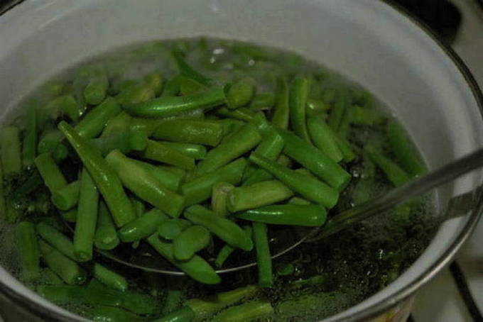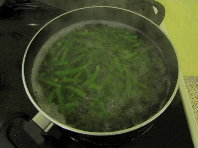 - Als de bonen droog zijn, moeten ze in stukken van maximaal 4 cm worden gesneden. Giet de peulen in een pan en vul met koud water. Breng het water aan de kook en kook de scheuten niet langer dan vijf minuten.