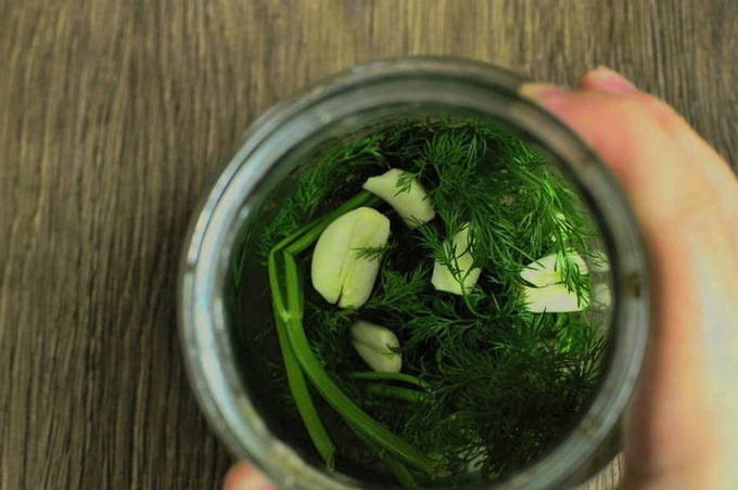 - Wij bereiden de rest van de ingrediënten. We wassen de dille en doen hem, na een beetje drogen met keukenpapier, in vooraf voorbereide potten. Haal het benodigde aantal teentjes van de knoflookbol en verwijder de schil. We sturen de knoflook naar containers. Leg vervolgens de bonen neer.