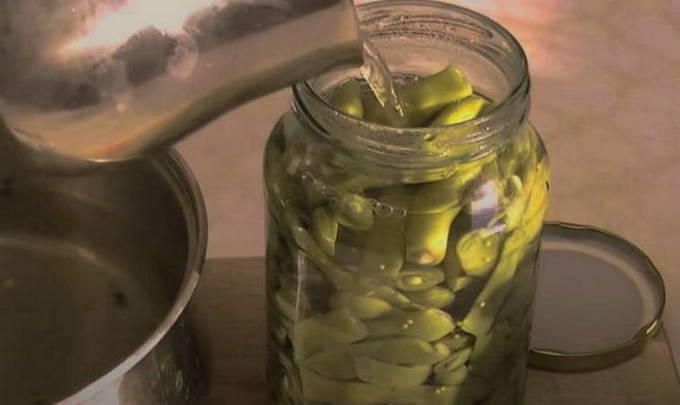 - Vul de bonen voorzichtig met marinade en dek de potten af met deksels. We rollen de containers op en wikkelen ze in omgekeerde positie met een deken. Na volledige afkoeling op een koele plaats bewaren.