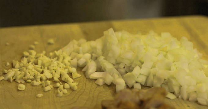 - We hebben fijngehakte uien en knoflook nodig. Eerst pellen we ze af. Daarna snijden we de ui in tweeën langs de kop en snijden hem dan pas in kleine stukjes. We voeren een vergelijkbare procedure uit met knoflook.