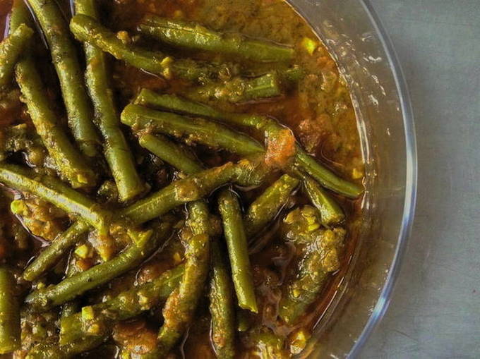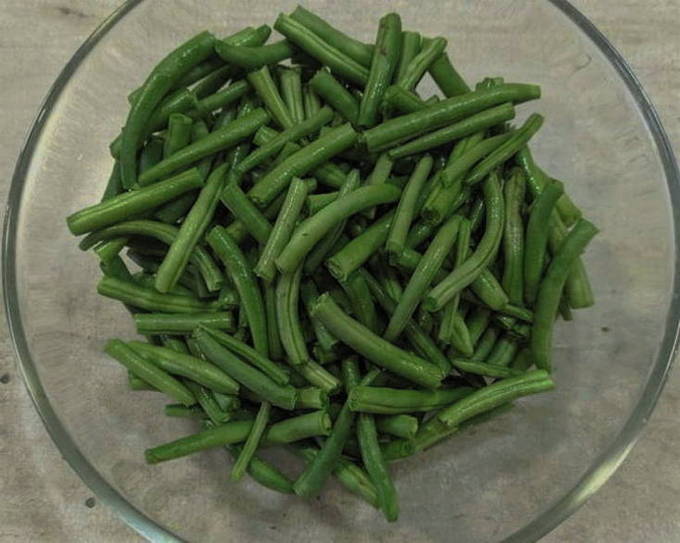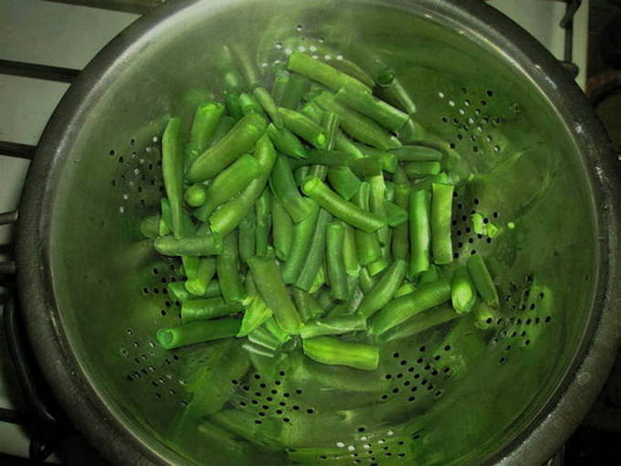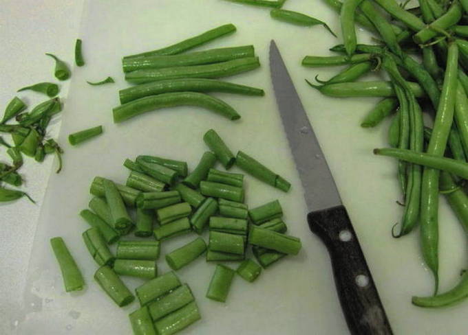 - We selecteren hele, jonge peulen om te naaien en snijden ze aan beide uiteinden af. Daarna wassen we het af met stromend water en laten we het drogen totdat alle vloeistof eruit komt. Snijd de bonen in langwerpige stukken.