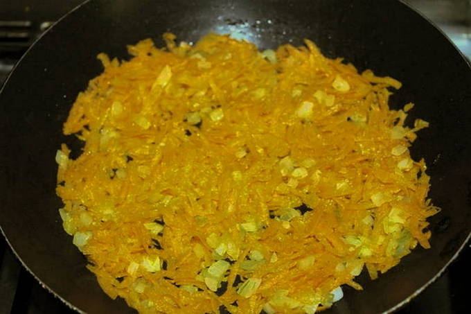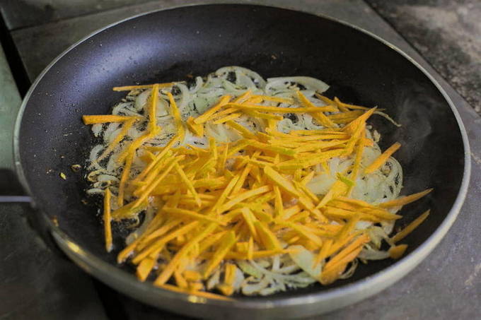 - Verdeel de plantaardige olie over de bodem van de pan. Verwarm de kom ongeveer een minuut op het vuur en giet de ui in de olie. Bak het, onder af en toe roeren, 3-4 minuten. Schil de wortelen. Afspoelen met water en raspen. Giet het over de ui en meng de ingrediënten. We blijven ze ongeveer drie minuten bakken.