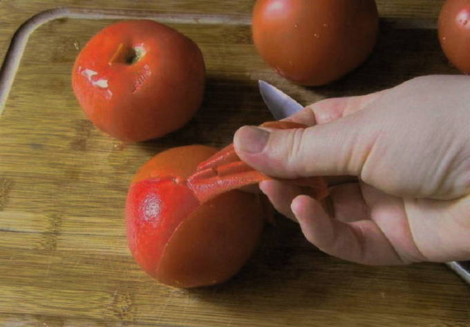 - We wassen de tomaten. We ontdoen ze van de schil: breng water aan de kook en giet er tomaten overheen. Giet na een paar minuten de vloeistof in de gootsteen en vul de tomaten met koud water. Verwijder na een paar minuten gemakkelijk de huid.