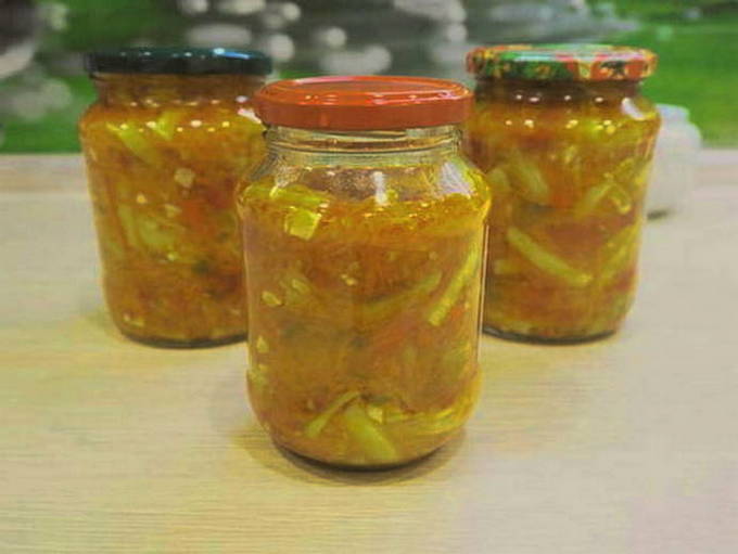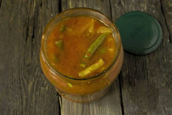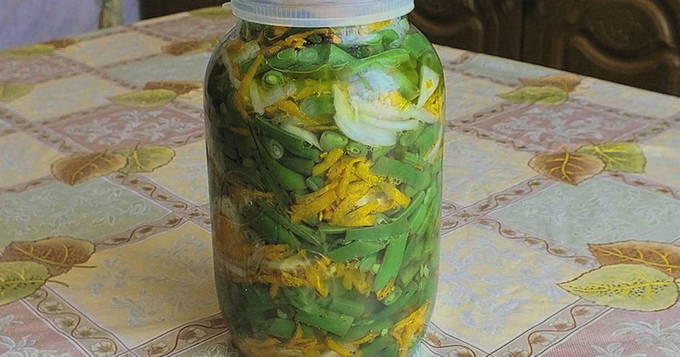 - We doen bonen en groenten in lagen in een gesteriliseerde pot. Vul ze met marinade en sluit de deksel. Draai de pot ondersteboven, wikkel hem in en laat hem afkoelen.