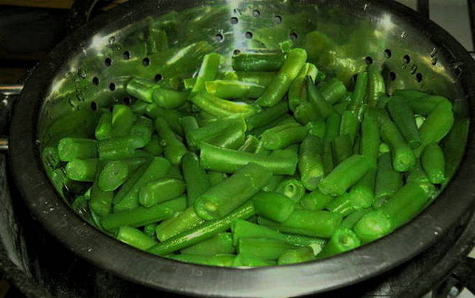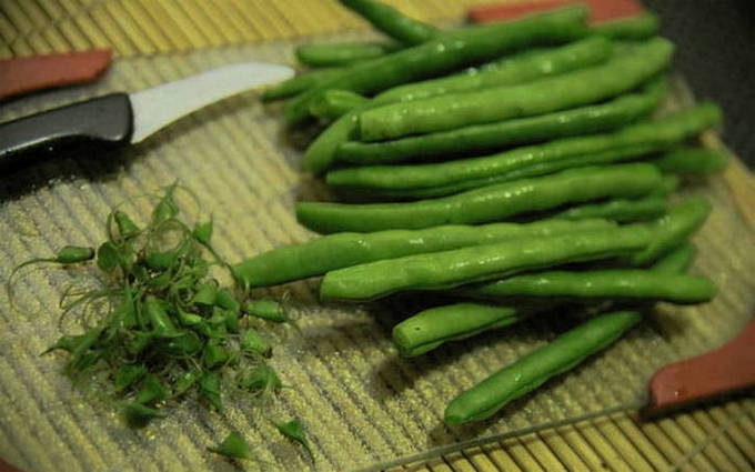 - De bereiding van bonen moet zeer zorgvuldig worden behandeld. Het is noodzakelijk om in eerste instantie een beetje onrijpe en jonge scheuten te kiezen, zodat je de bonen niet heel lang hoeft te koken en het mogelijk was om de meeste van zijn nuttige eigenschappen te behouden. Na het verwijderen van te rijpe en bedorven peulen, moeten de bonen worden gehakt en de ruwe uiteinden worden verwijderd en worden afgespoeld met water met behulp van een vergiet.