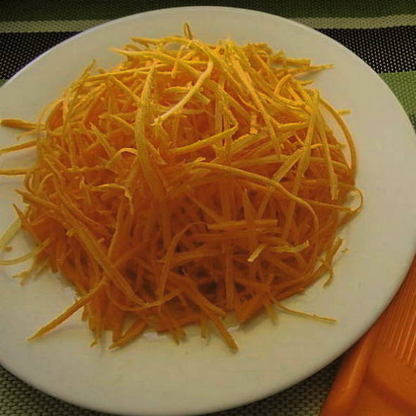 - Laten we beginnen met het snijden van groenten voor het bereiden van bonen. Snijd voorzichtig de bovenste laag van de wortel af met een mes (deze moet heel dun zijn). Daarna spoelen we de groente samen met de peper. Maal het met een Koreaanse wortelrasp.Om het voorgerecht niet te pittig te maken, is het beter om de zaadjes van de peper te verwijderen. Als je van een scherpere variant houdt, snijd je de paprika in ringen en verwijder je alleen de steel.