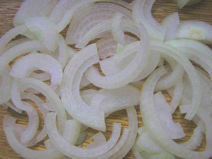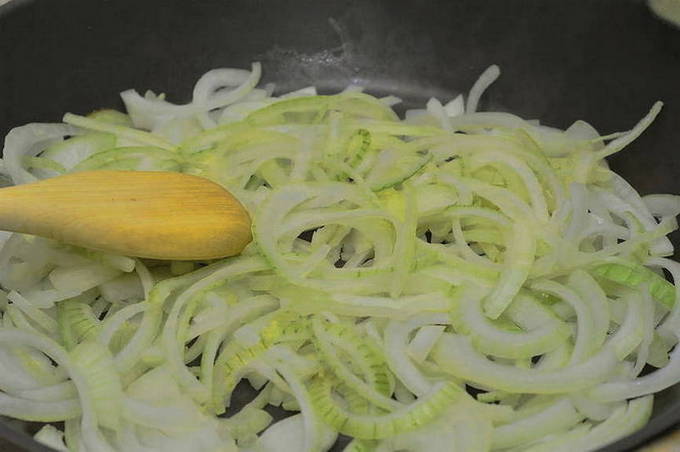 - We verwijderen de schil van de ui. We snijden het in de lengte door met een scherp mes en snijden elk deel in halve ringen. Giet olie in de pan. We verdelen het langs de bodem van de container en verwarmen het een minuut op het fornuis. Doe de ui in de pan. Bak het.