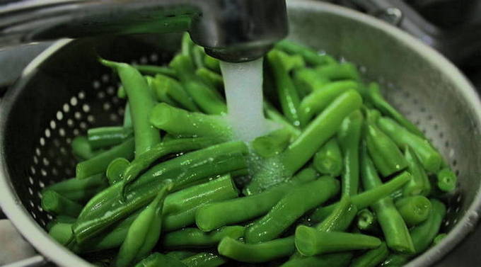 - Jonge scheuten sperziebonen onderzoeken we zorgvuldig. Gooi overrijpe peulen weg. Als er bedorven scheuten zijn, verwijderen we die ook. Daarna snijden we de uiteinden van de peulen aan beide kanten af. We wassen de bonen met stromend water. Voor dit doel is het het handigst om een vergiet te gebruiken.