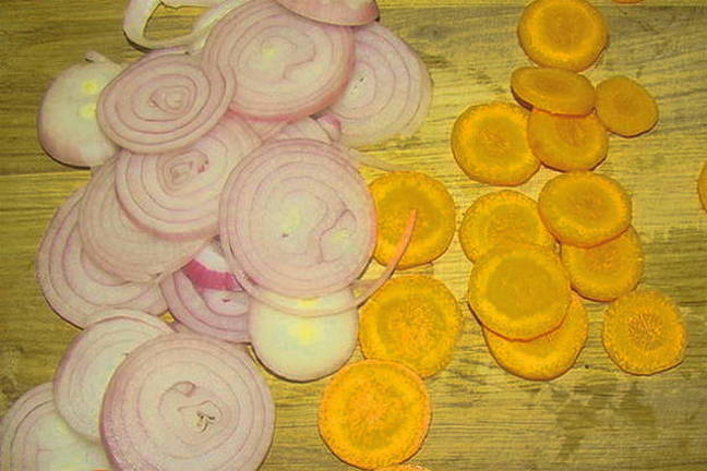 - Schil de ui en wortel.Verwijder de schil van de ui en snijd de bovenste laag van de wortelen af. Spoel de uien en wortelen goed af en snijd de ui in ringen en de wortel in cirkels. We leggen de ingrediënten in blikken, die vooraf moeten worden schoongemaakt en met warmte worden behandeld.