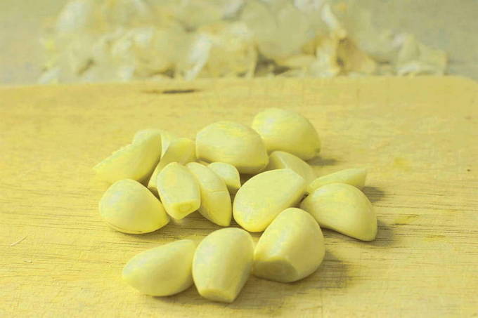 - We verwijderen de schillen van de teentjes knoflook en doen ze ook in potten. Giet de peperkorrels. We verdelen de bonen en gaan verder met de bereiding van de marinade.