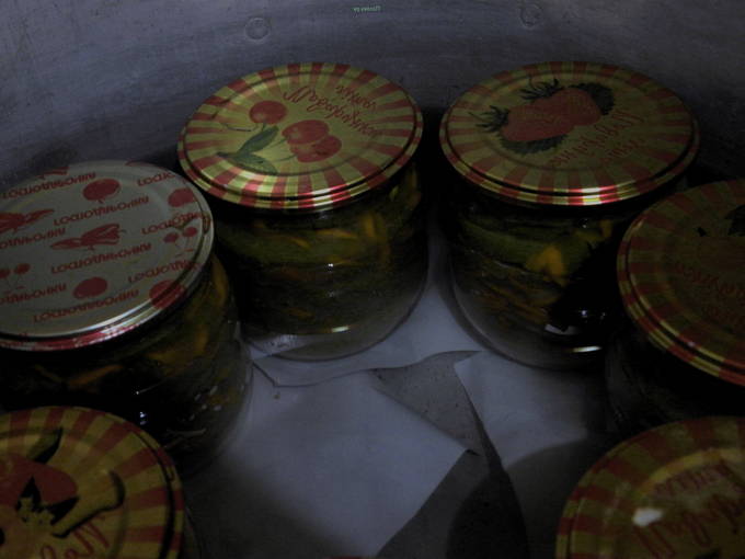 Giet hete salade in potten met een pollepel. We rollen de containers met deksels op en keren om. Bedek ze met een warme deken en wikkel ze in. We wachten een paar dagen tot het gerecht is afgekoeld.