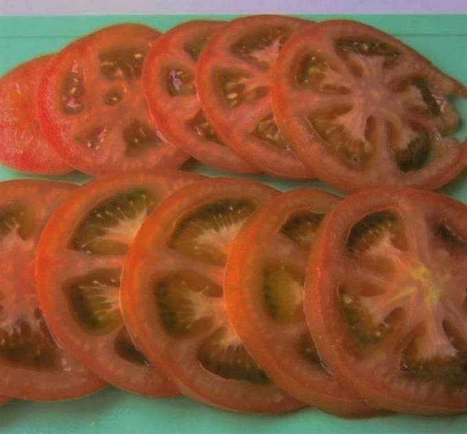 - We wassen de tomaten in een stroom water. Verwijder overtollig vocht met een handdoek. Snijd de tomaten in cirkels.