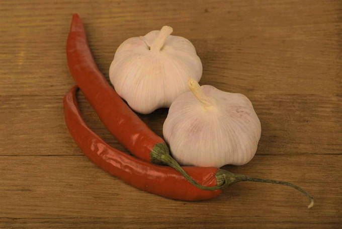 - Verwijder de schil van de knoflook, spoel af met de chilipeper. Snijd de steel af en haal de zaadjes eruit. Droog de gewassen koriander. Hak de ingrediënten zo klein mogelijk.