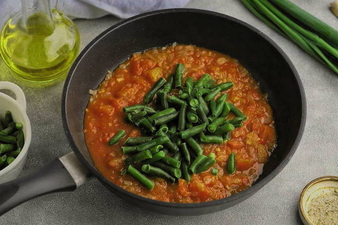 - We verhitten nog een koekenpan op het fornuis. We doen er tomaten in. Laat sudderen tot puree en verdeel de bonen. Bestrooi het mengsel met kruiden, zout en roer. Giet na 15 minuten de ui uit en laat nog 10 minuten sudderen.