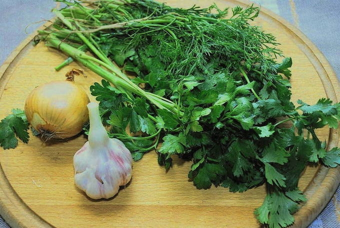 - Doe de ui en paprika in een kom. Voeg knoflook aan hen toe. We wassen en malen de koriander, sturen hem naar de knoflook. Maal de walnoten fijn en meng ze met de rest van de ingrediënten. Het blijft om de massa op smaak te brengen met azijn, kruiden en bonen.