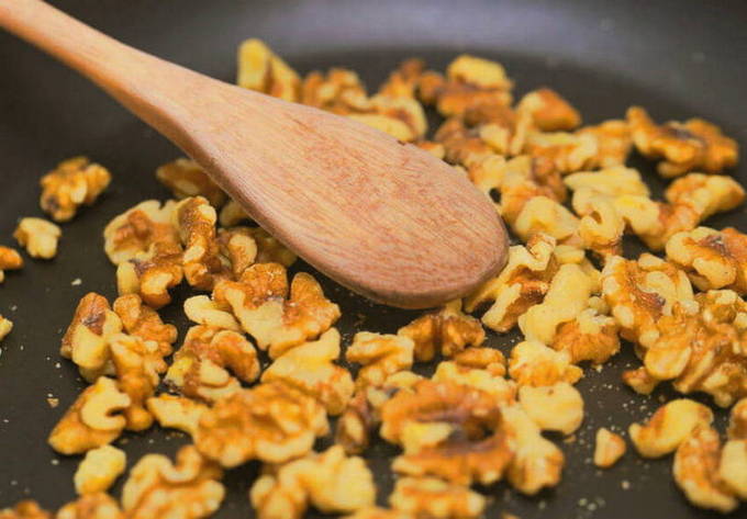 - Hak de walnoten. We halen ze uit de schaal en doen ze in de pan. Bak lichtjes op laag vuur. Giet de noten in een aparte container.We spoelen de pan af en gieten er plantaardige olie in. Als de pan met olie is verwarmd, giet je de paprika en ui erin. Wij bakken de producten.