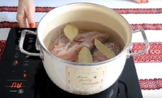 Was een pond rundvlees en doe het in een pan. Voeg 2/3 water toe, voeg lavrushka toe en kook. Zet het vuur lager en kook gedurende 2 uur, waarbij u regelmatig het schuim verwijdert.