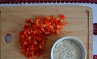 Spoel de rijst en paprika apart af, verwijder de zaadjes uit de paprika en snij in kleine blokjes.