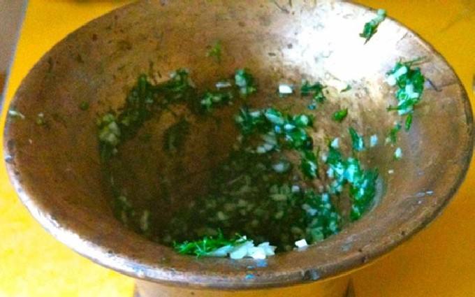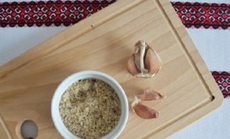 - Pel de knoflook, voeg droge koriander toe en overgiet met 1 el. ik. zonnebloemolie. Snijd de koriander fijn en meng met knoflook en kruiden.