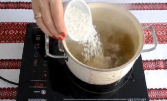 - Giet rijst bij de soep, voeg een peperpeul toe, kook en zet het vuur lager.