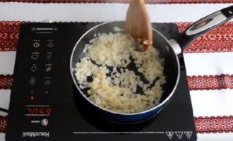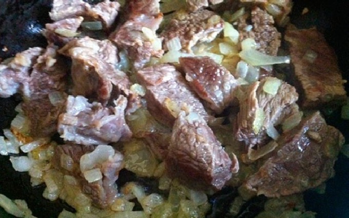 - Fruit in een hete koekenpan met hete olie de uien en de plakjes rundvlees gedurende 3 minuten, af en toe roeren.
