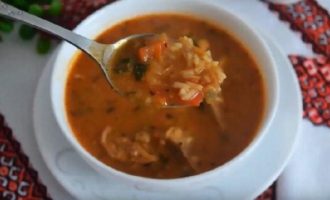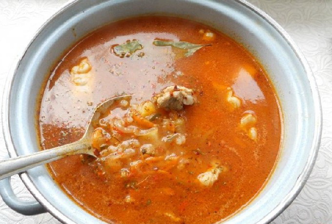 - Leg de rijst 15 minuten in de bouillon, doe het vlees terug in de pan, stuur de uien, tomaten, kruiden, geperste knoflook en tkemali-saus. We koken de soep gedurende 10 minuten en laten hem voor dezelfde hoeveelheid brouwen.