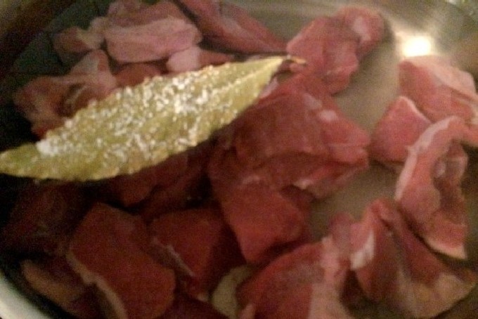 - Vul een pan van 3 liter met 2/3 water en voeg grof gesneden rundvlees, lavrushka en 1 tl. zout. Kook op middelhoog vuur gedurende 30 minuten na het koken.