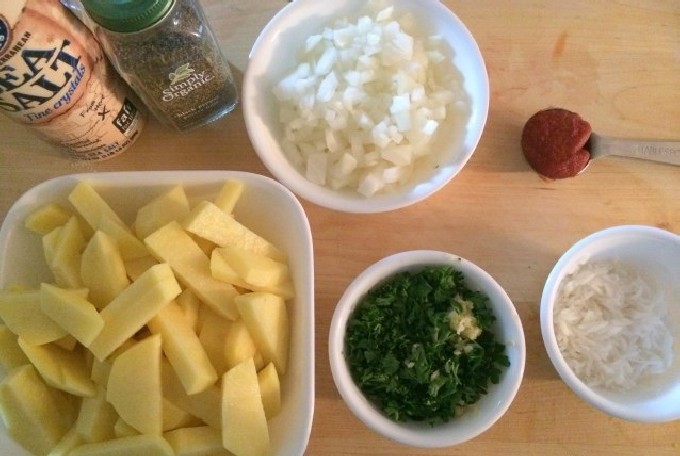 - Schil en was de aardappelknollen, snijd ze in blokjes. Was en hak de peterselie, voeg er fijngehakte knoflook aan toe. Pel de ui en hak fijn.