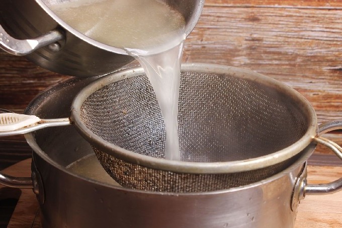 - Als het vlees in de winkel wordt gekocht, is het beter om het water na het koken af te tappen, het vlees en de pan af te spoelen om alle onnodige toevoegingen uit het vlees te verwijderen. Leg het afgewerkte vlees op een bord en zeef de bouillon door een zeef.