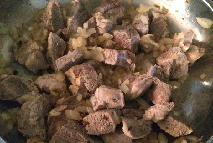 - Pel de uien, snijd ze in kleine stukjes en bak ze goudbruin in hete olie. Voeg direct stukjes afgekoeld rundvlees toe.